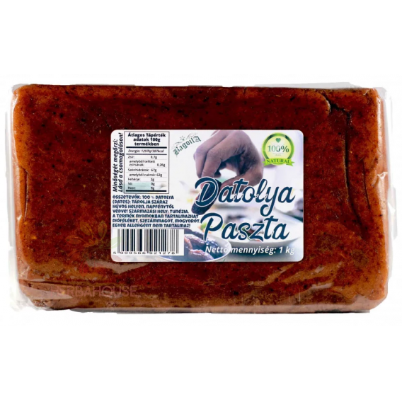 Datolya Paszta, 100 % datolyából készült termék. A datolya természetes cukortartalmától édes ízű. Tökéletes édesítésre, süteményekhez, de önmagában fogyasztva is.Összetevők: 100 % datolyaJellemzők