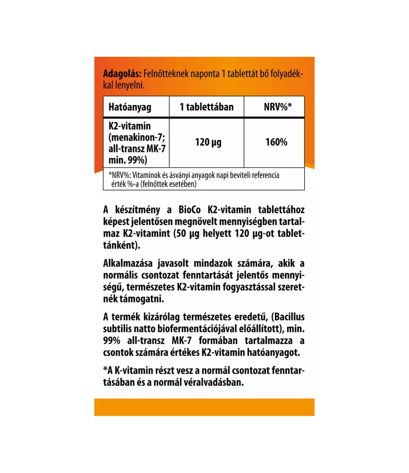 120 mikrogramm természetes eredetű K2-vitamint tartalmazó étrend-kiegészítő tabletta