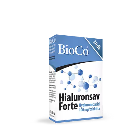 A BioCo Hialuronsav Forte tabletta nagy mennyiségben tartalmaz hialuronsavat (100 mg/tabletta), ezzel járulva hozzá a szervezetben lévő hialuronsav mennyiségének pótlásához.