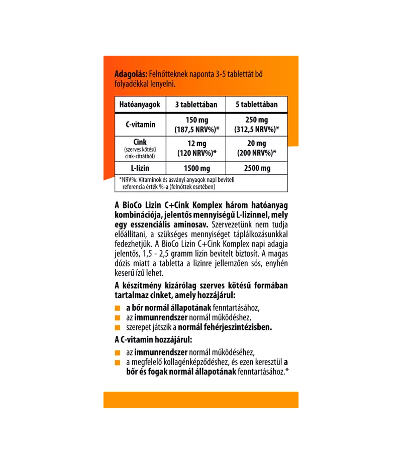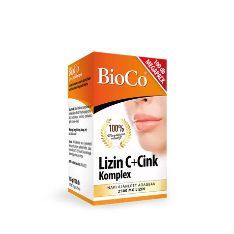 A BioCo Lizin C+Cink Komplex három hatóanyag kombinációja, jelentős mennyiségű L-lizinnel, mely egy esszenciális aminosav. Szervezetünk nem tudja előállítani, a szükséges mennyiséget táplálkozásunkkal fedezhetjük. A BioCo Lizin C+Cink Komplex napi adagja jelentős, 1,5 - 2,5 gramm lizin bevitelt biztosít. A magas dózis miatt a tabletta a lizinre jellemzően sós, enyhén keserű ízű lehet.