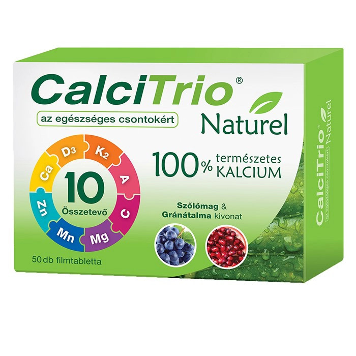 A CalciTrio® Naturel filmtabletta 100%-ban természetes kalciummal járul hozzá a csontok egészségéhez.