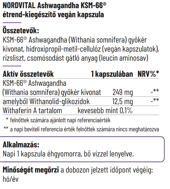 KSM-66 Ashwagandha (Withania somnifera) gyökér kivonat, hidroxipropil-metil-cellulóz (vegán kapszulatok), rizsliszt, leucin