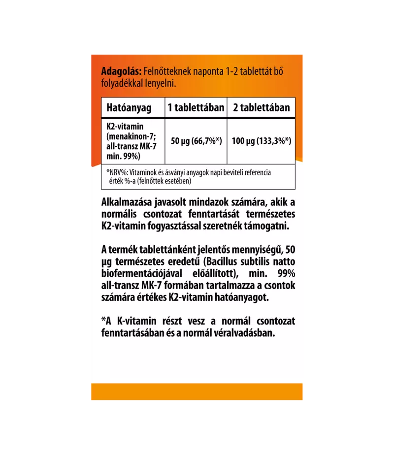 A termék tablettánként jelentős mennyiségű, 50 µg természetes eredetű (Bacillus subtilis natto biofermentációjával előállított), min. 99% all-transz MK-7 formában tartalmazza a csontok számára értékes K2-vitamin hatóanyagot.